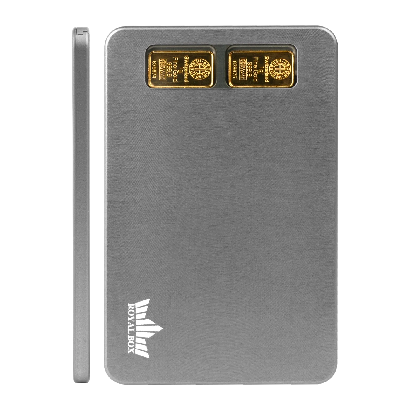 The S-Bullion Royal Box – Bullion Titanium is a sleek and durable storage case made for those who want to keep small bullion bars in style. It is based on the S-Line Turbo design and re-defined for discreet bullion storage. The case holds eight Swiss-certified 1 g bullion bars, offering both elegance and practicality. The body is built of high-grade aerospace aluminium, giving a lightweight yet strong structure that will endure daily use.